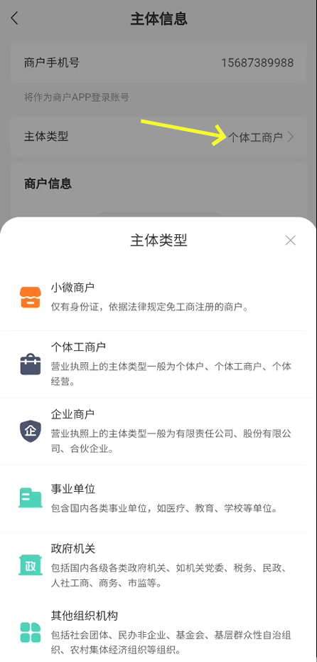 主体类型根据自己情况填写,无执照的选小微,上传执照会自动识别